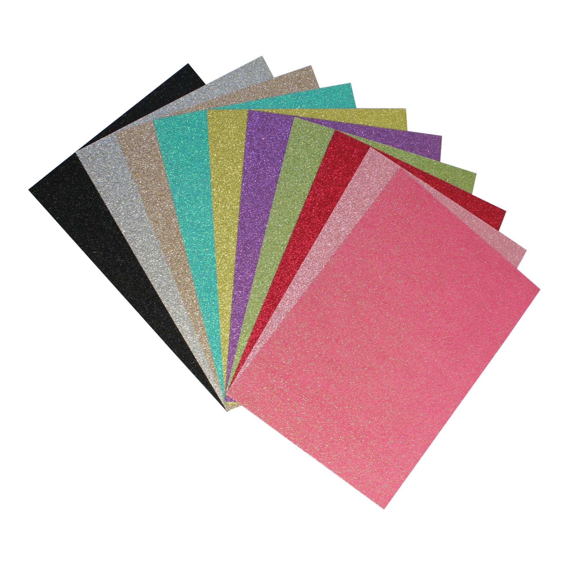 Add a touch of sparkle to all of your arts & crafts with this pack of gorgeous A4 glitter cards. Our glittery cards come in a pack of 10 in a range of assorted colours. Use these cards for DIY, craft projects, festive-related projects, decorating card crowns for royal role-play, decorate greeting cards or scrapbooks. Our glitter card pack comes in an assortment of colours including black, silver, rose gold, light blue, gold, purple, light green, red, candy pink and pink. Materials: CardSize: A4 (21 x 29.7cm)