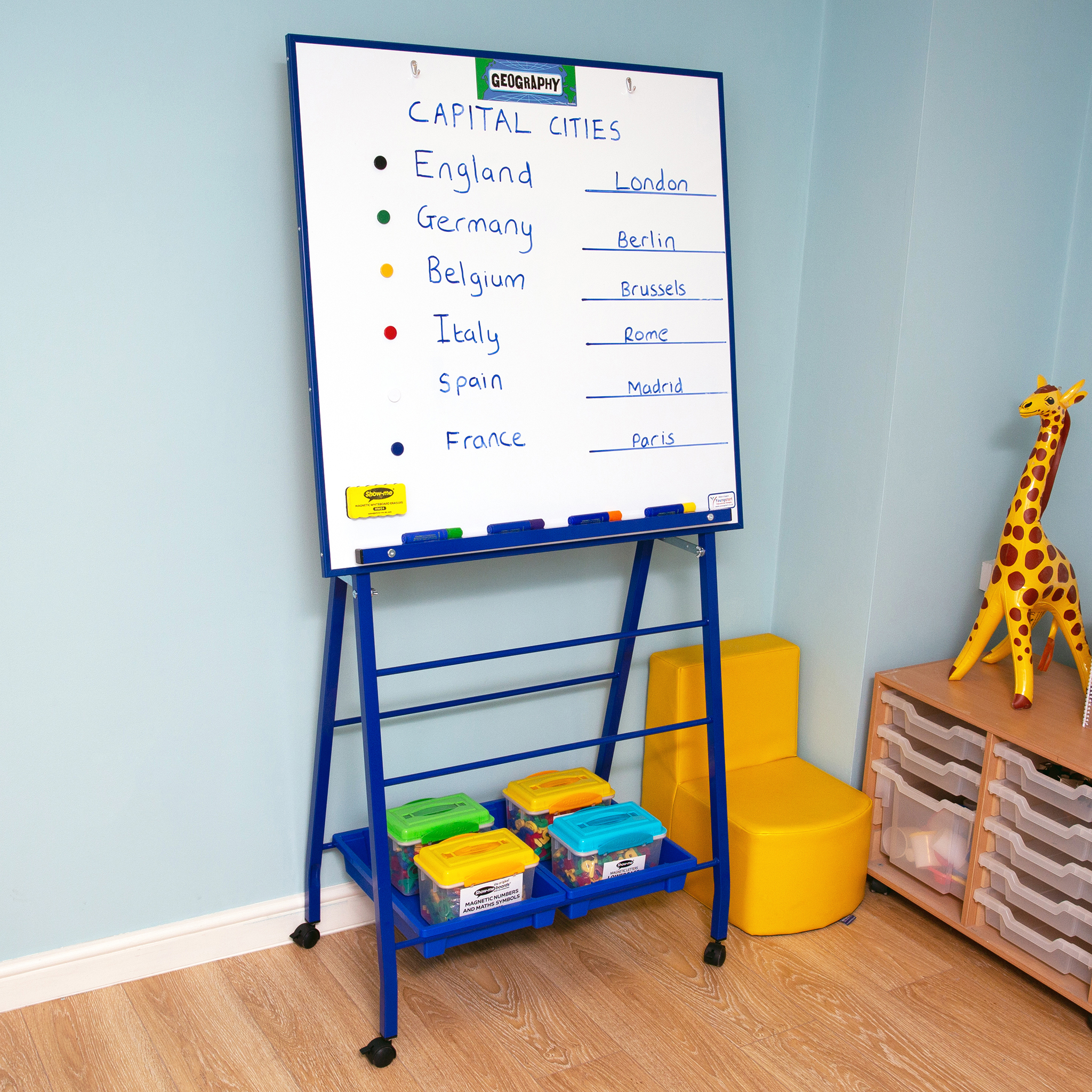 This premium quality, height adjustable whiteboard easel is a perfect teaching aid for front of class. The extra large board is both magnetic and drywipe, making it suitable for a range of teaching methods, and the four quick and easy height adjustments accommodate all age groups. The sturdy A-frame construction also guarantees total safety and stability whatever the height.