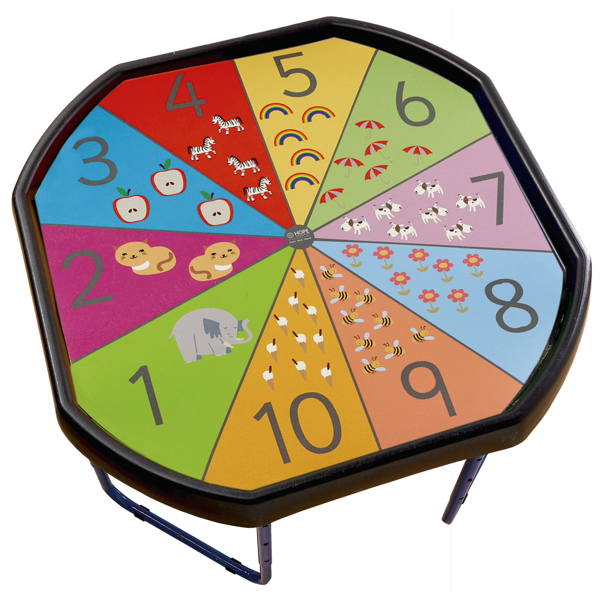 Early Number Play Tray Mat is designed to fit a Play Tray, this fun, sensory Number mat, will make learning your numbers to 10 interactive and inspiring. Featuring fun animals and objects the mat makes counting lots of fun! Can be used indoors or outdoors. Diameter 880mm.