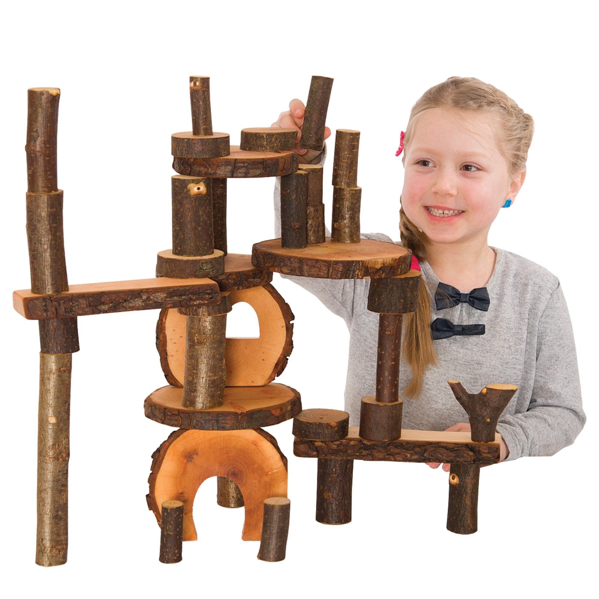 Set of 36 blocks, weighing nearly 3kg, for individual or small group play. Comes in a cotton drawstring bag and includes a door and window piece.Top quality building blocks, made from alder, hazel and white beech. The surface is oiled with linseed oil (with the exception of the barkless blocks). The bark does sit stable on the wood, although we do not recommend this product for children younger than 3 as it is a natural product pieces of the bark may become detached. All blocks are cut perfectly parallel and come in step lengths: 2, 4, 6, 8cm and so on. Eco blocks allows children to build much taller and more stable structures as the discs up to 20cm in diameter will stabilise structures.