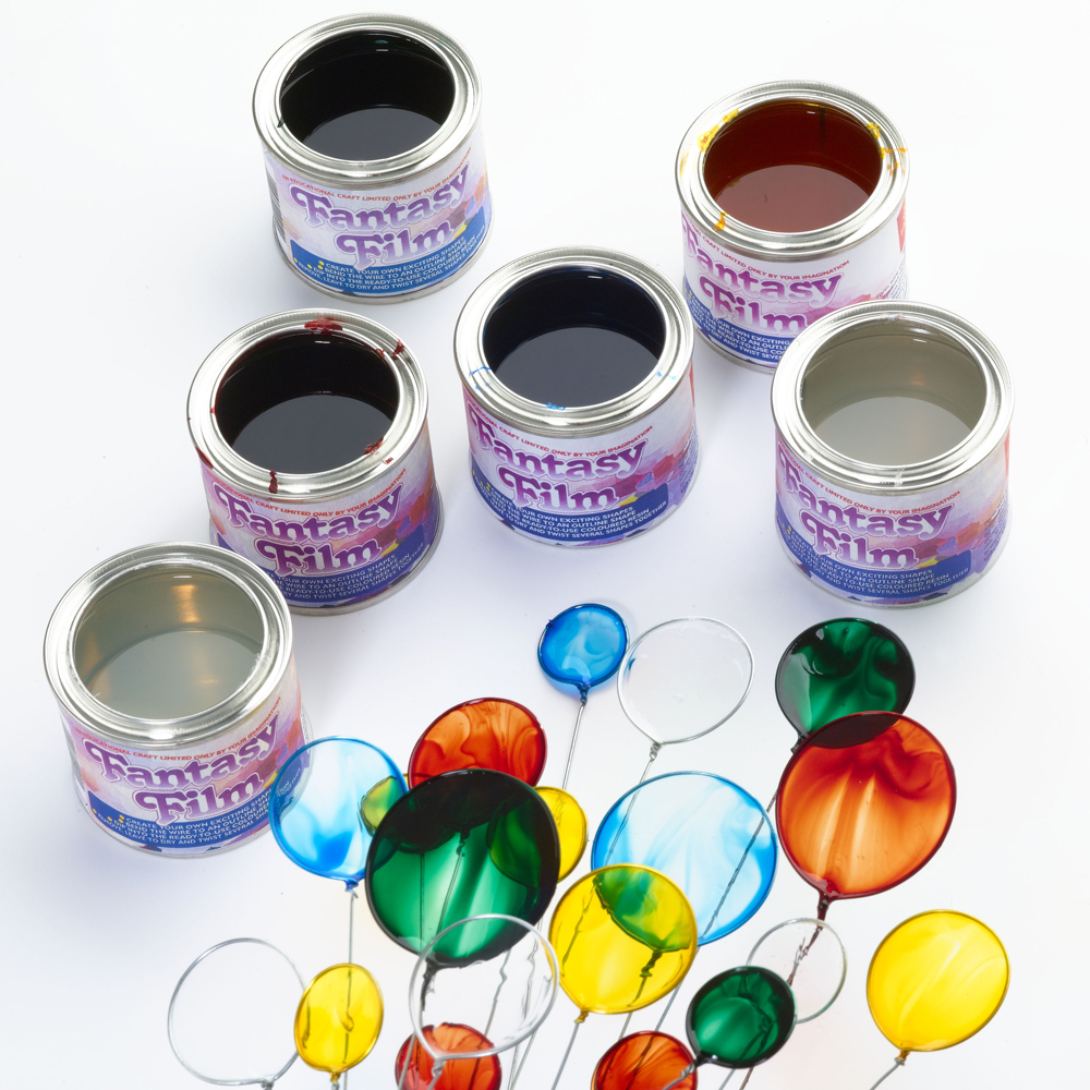 The Transparent Colours pack contains 125ml pots of transparent film in Ice Blue, Ruby Red, Golden Yellow, Green and Crystal Clear plus a pot of thinner.