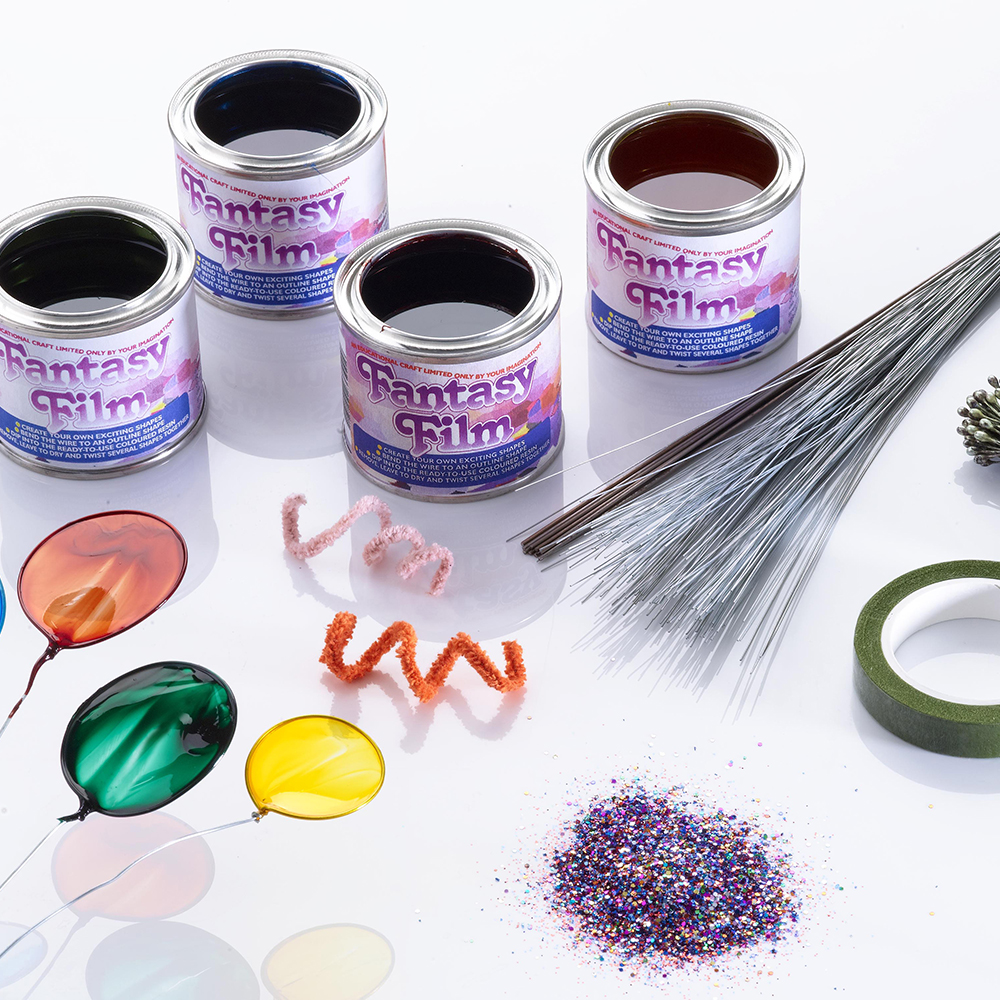 Contains: Fantasy Films in red, yellow, blue, green, forming wire, florists’ tape, floral stem wires, flower stamens and instructions.