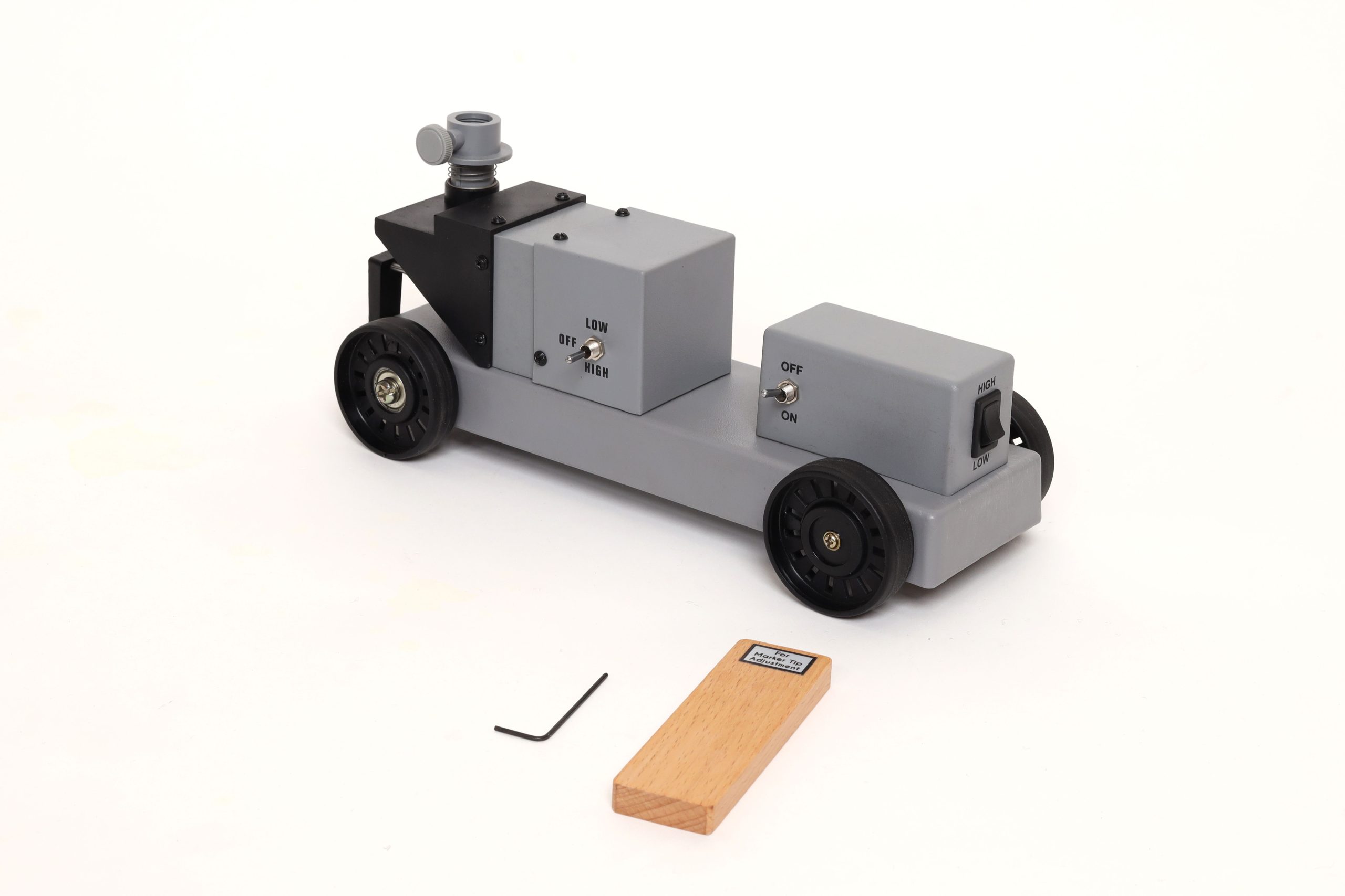 If you switch the motor to one of the four present speeds, students are given a stunning demonstration of constant velocity because no matter what constant speed the dots were traveling at, they are always equally spaced. You can also switch the car’s wheels to roll freely.