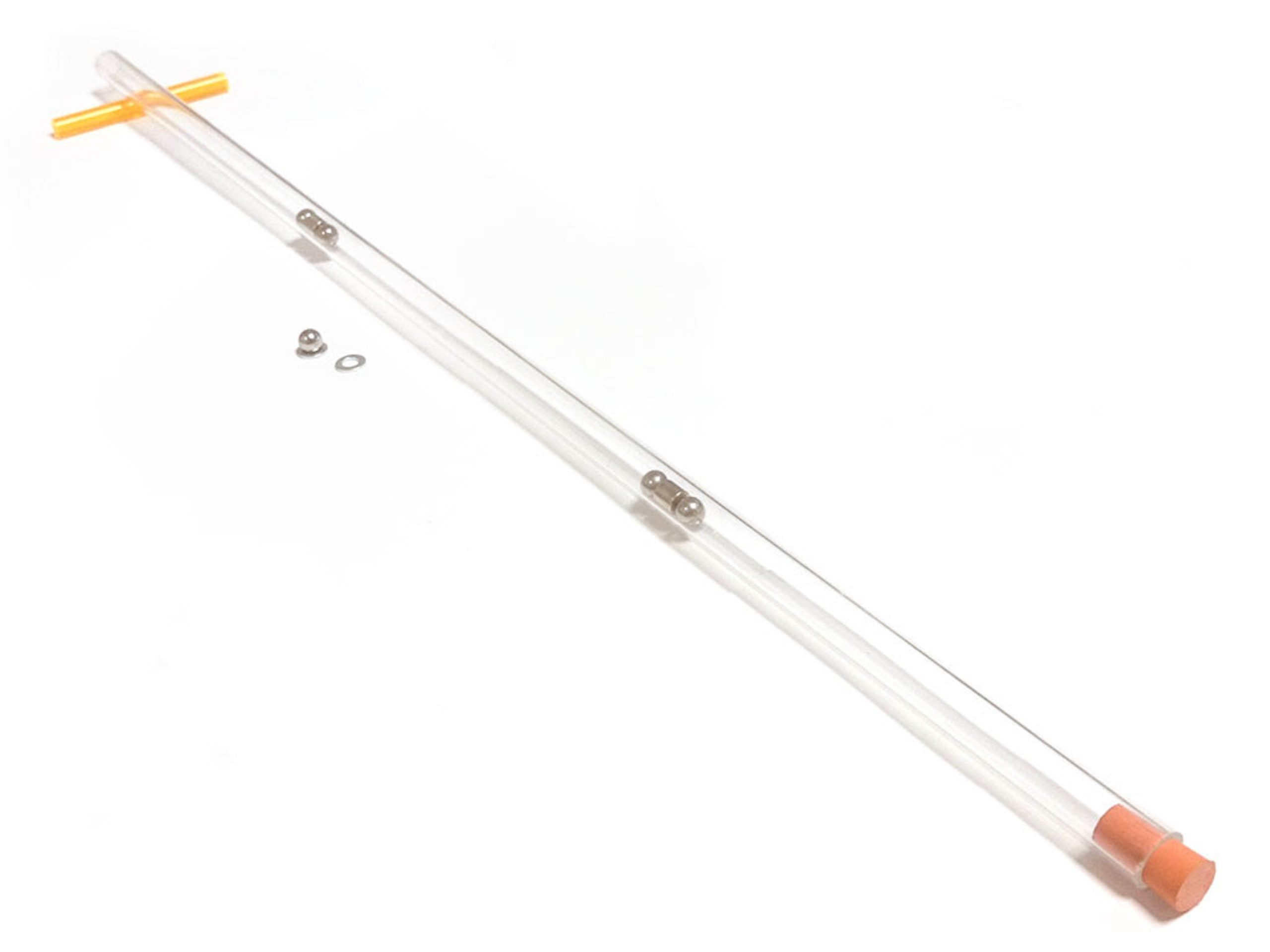 This demonstration of the Gauss gun effect uses a 660mm long section of acrylic tube to house rare earth magnets and ball bearings. One end is raised slightly to allow the first ball to begin its movement and there is a rubber stopper at the other end to prevent any dangerous projectiles.