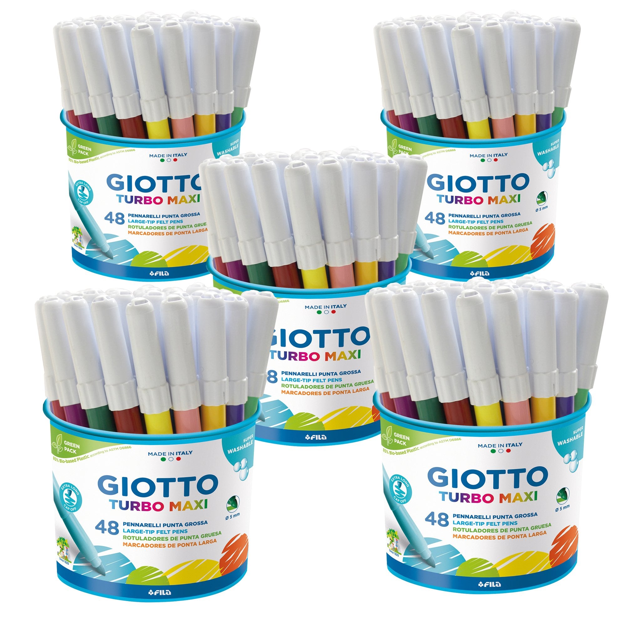 Save money when you buy 4 packs of the Giotto Turbo Maxi Chubby Markers pack of 48.Broad, fibre tipped pens with water based, washable ink that is very easy to remove from skin and fabric. Bulk pack of 4 pen pots. Each pot contains 48 pens.