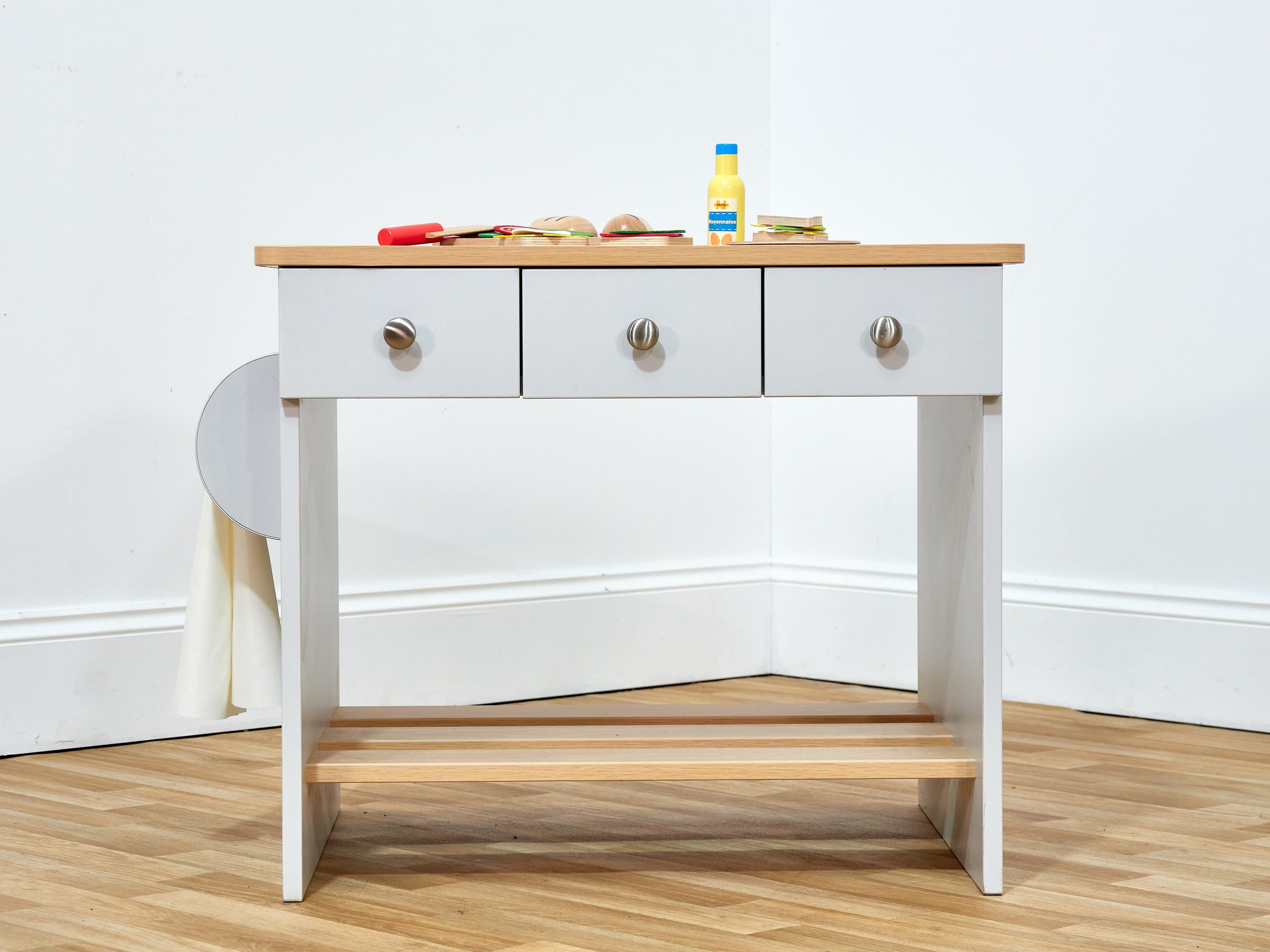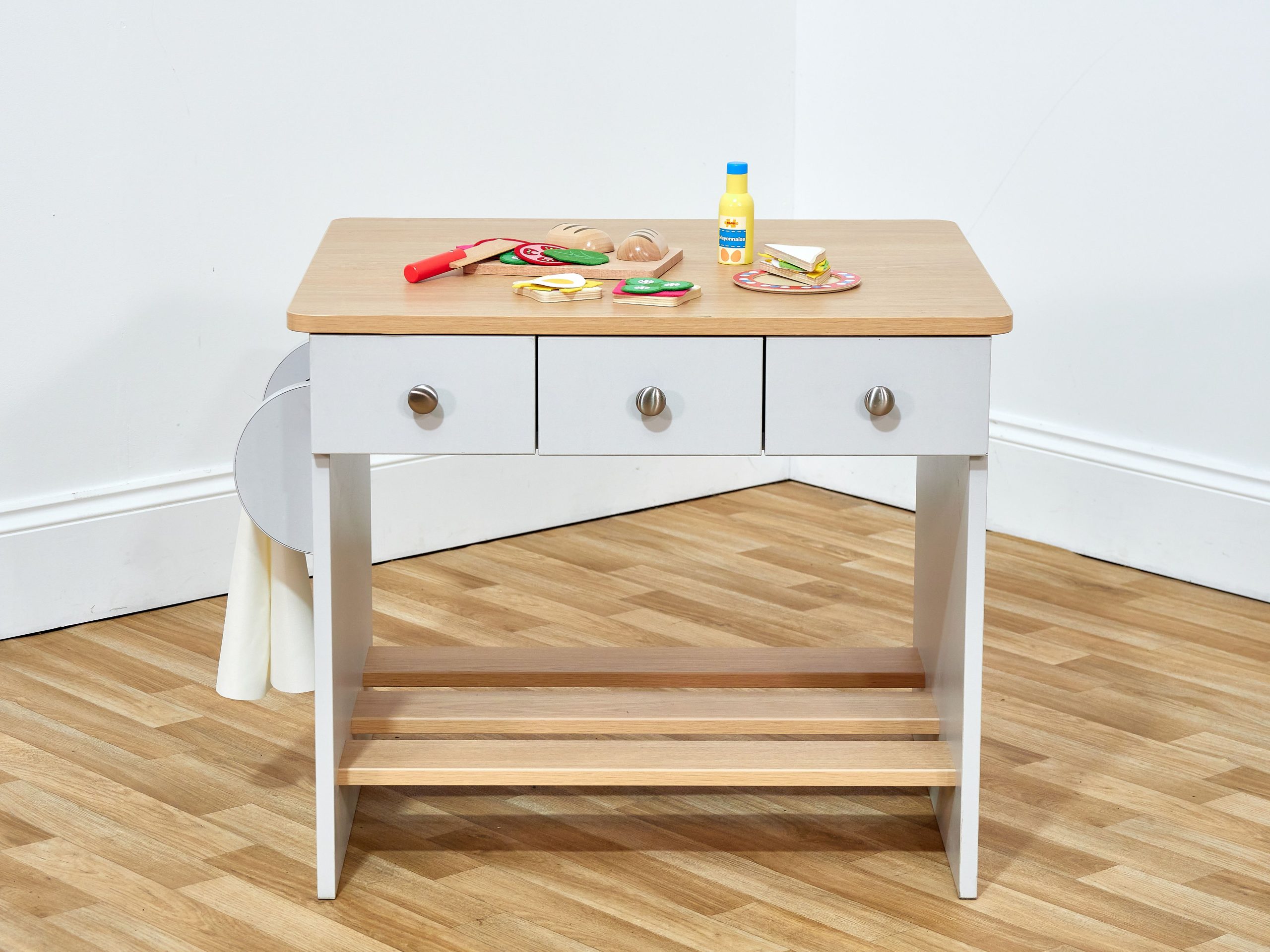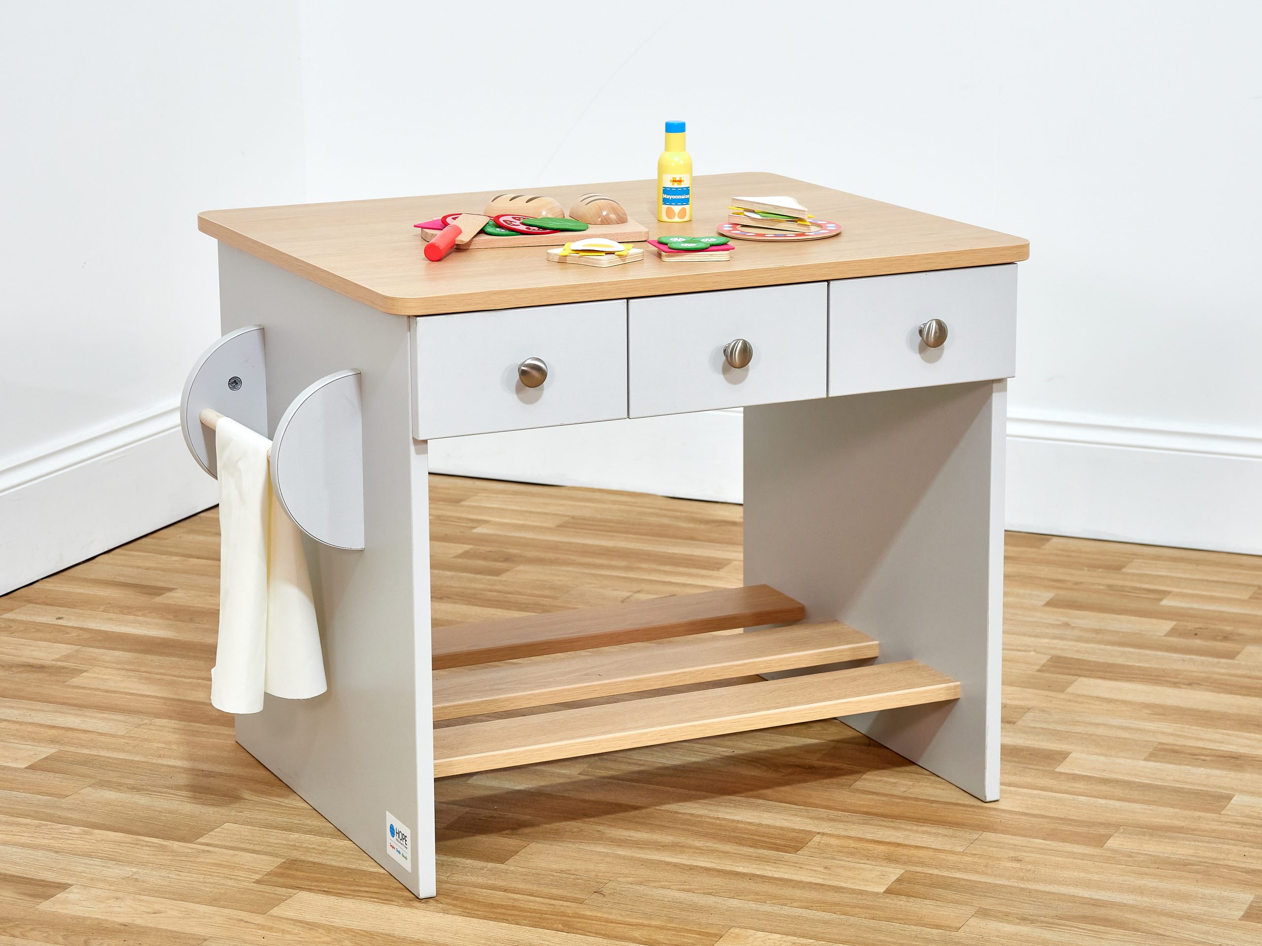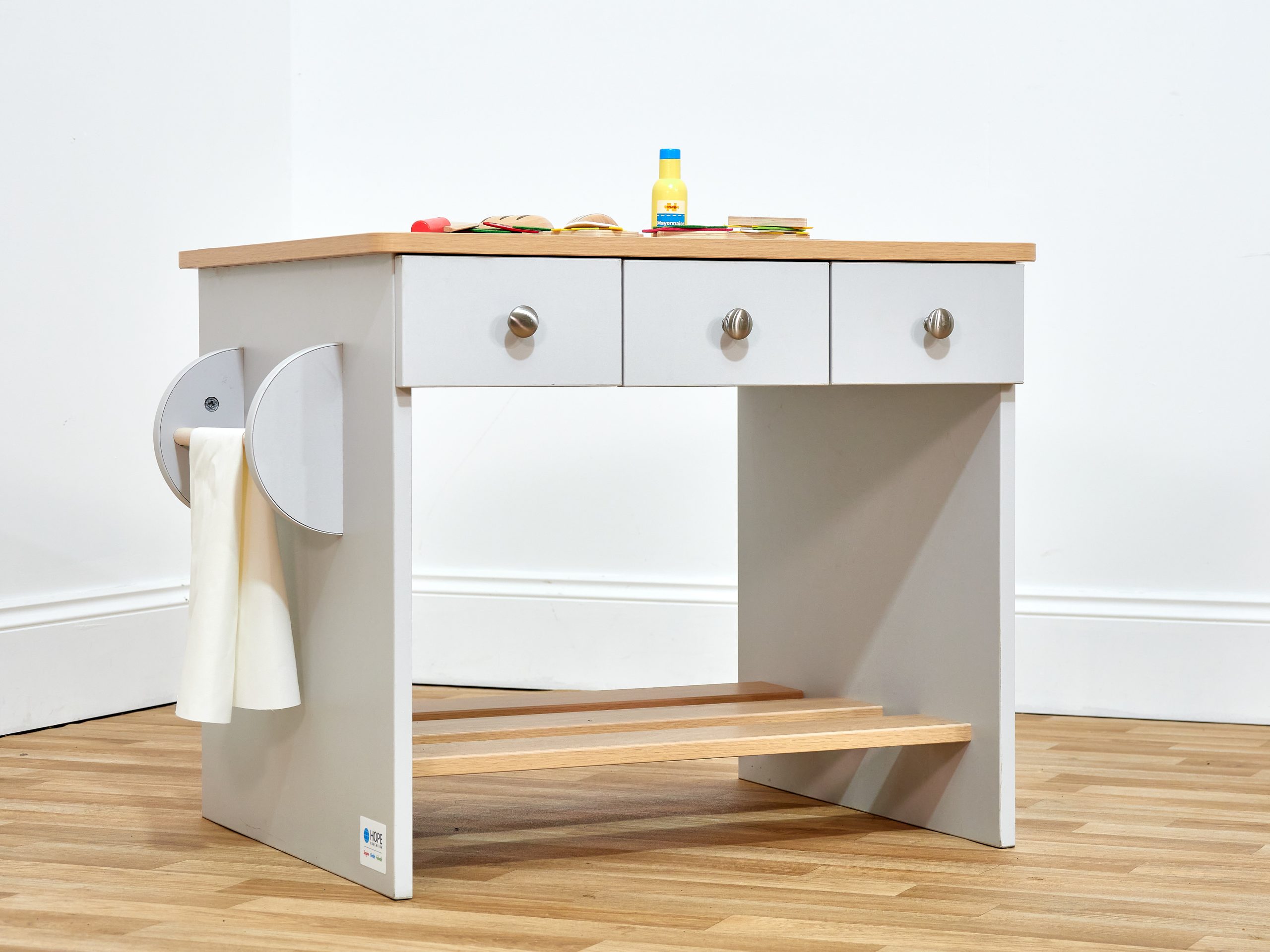 This charming island will make the perfect addition to any of our contemporary kitchen sets or use separately for baking cakes, pies and sweet treats. Featuring 3 safety drawers with stops, a handy open storage rack and even a towel rail.