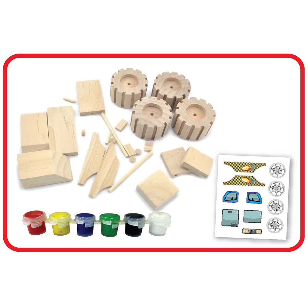 Includes: pre-cut pieces of wood, paint brushes, paint, and glue