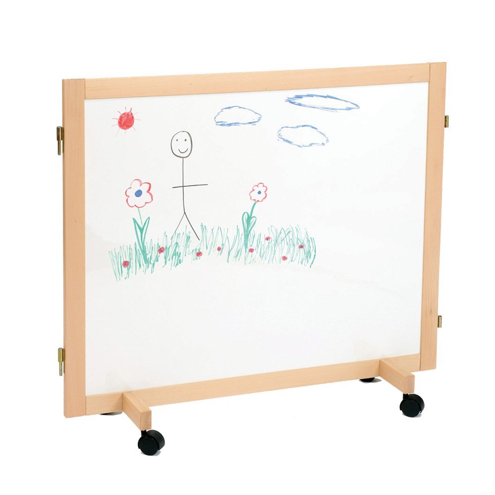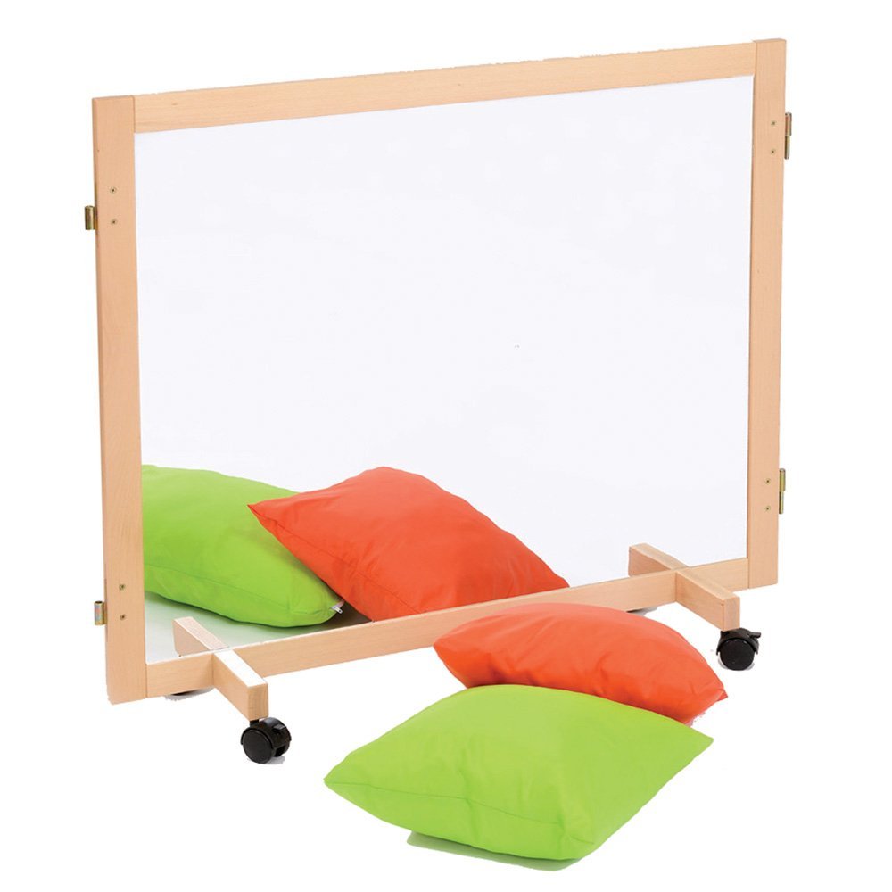 This double sided room divider features:solid beech wood frame a mirror surface on one side and a drywipe board on the reverse. units can easily be linked together are mobile for ease of movement. can be linked at differing angles not just in a straight line or at a right angle. As well as using the dividers to segregate areas they are designed to offer play value and enjoyment with two different surfaces. Size: W105cm x H93cm x D33cm. Our mirror/drywipe divider comes with a 1 year warranty.Standard delivery times may not apply to this product. Please contact Customer Care if you require further information.