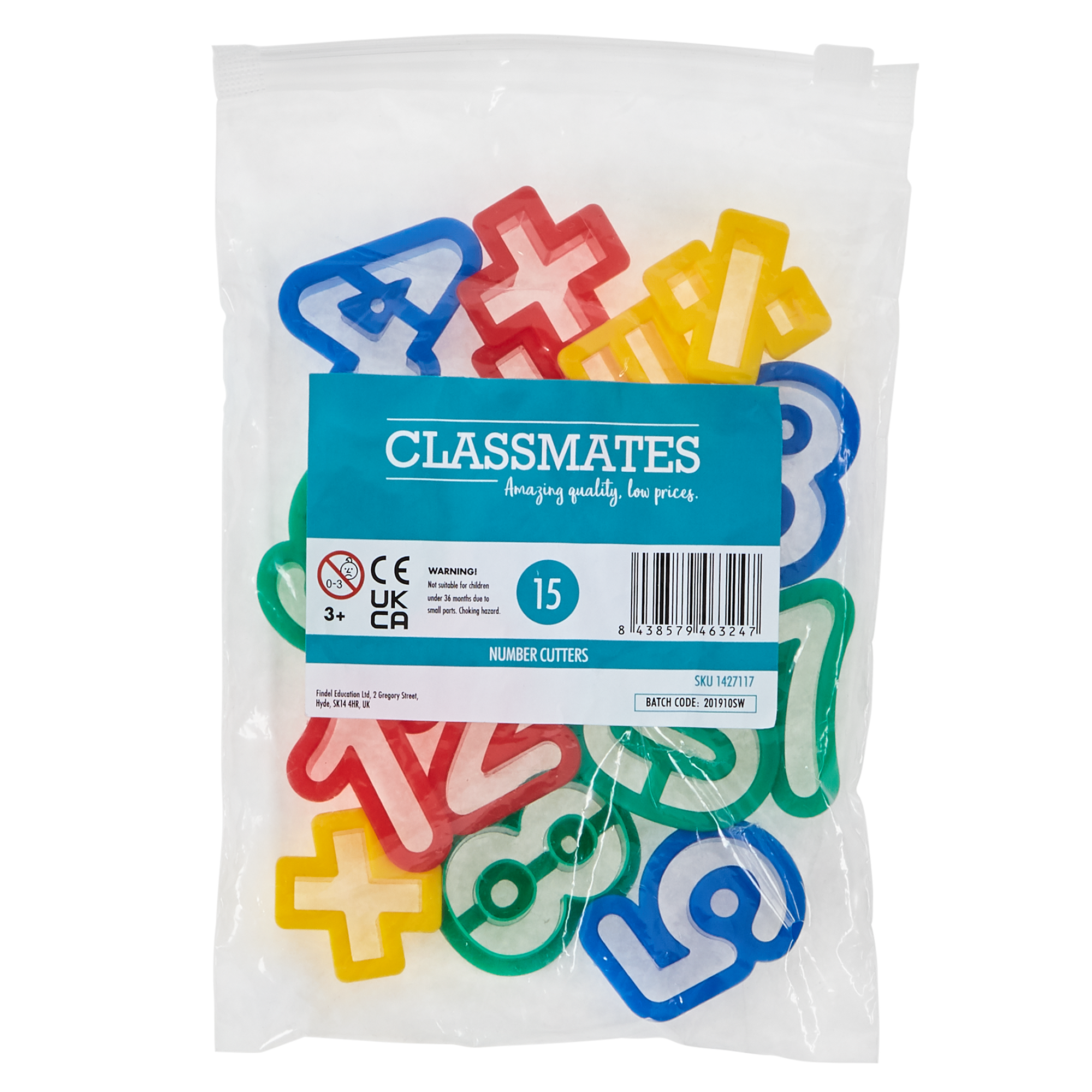 Set of 15 sturdy plastic dough cutters in assorted colours, containing numbers 0 to 9 and arithmetic symbols.