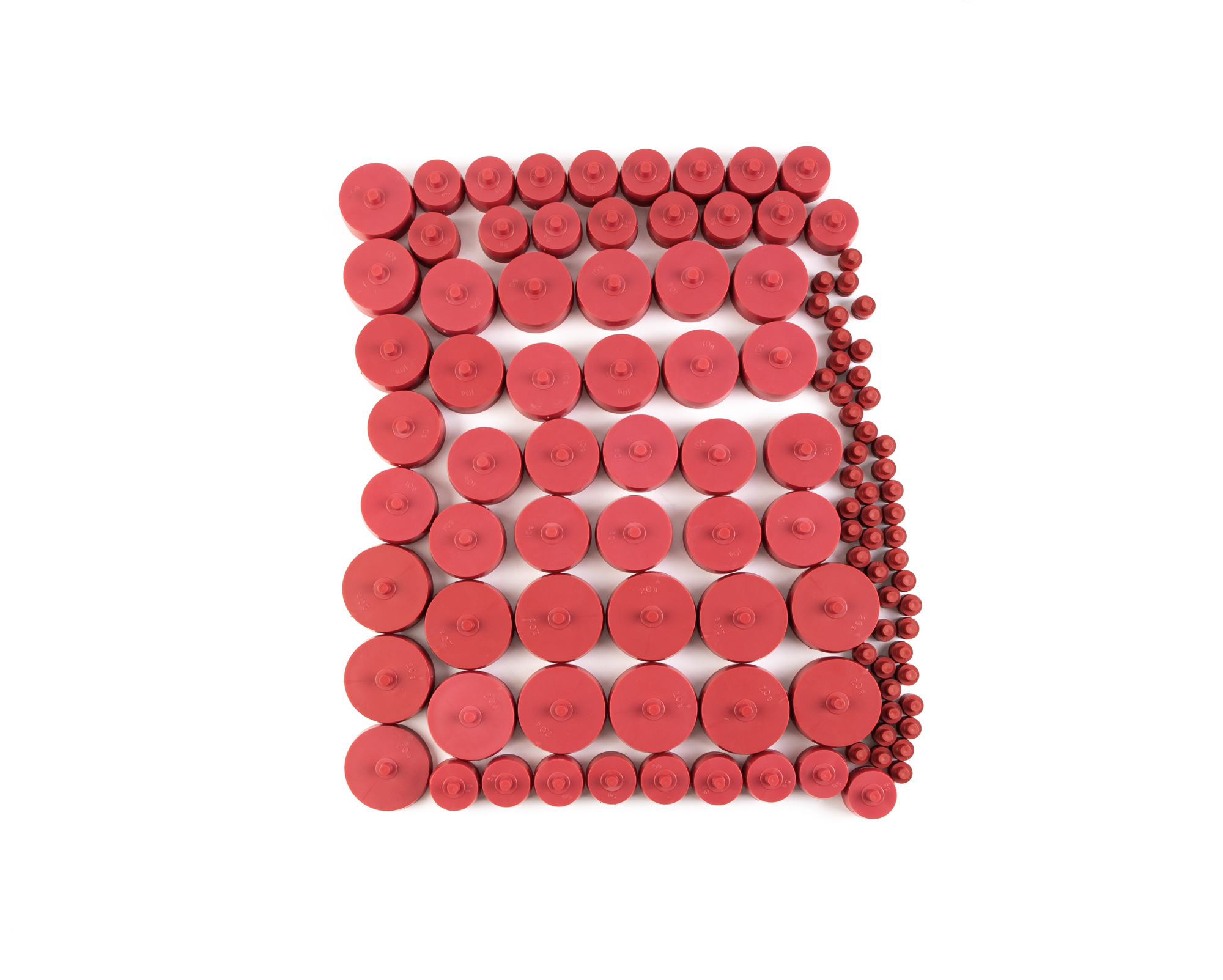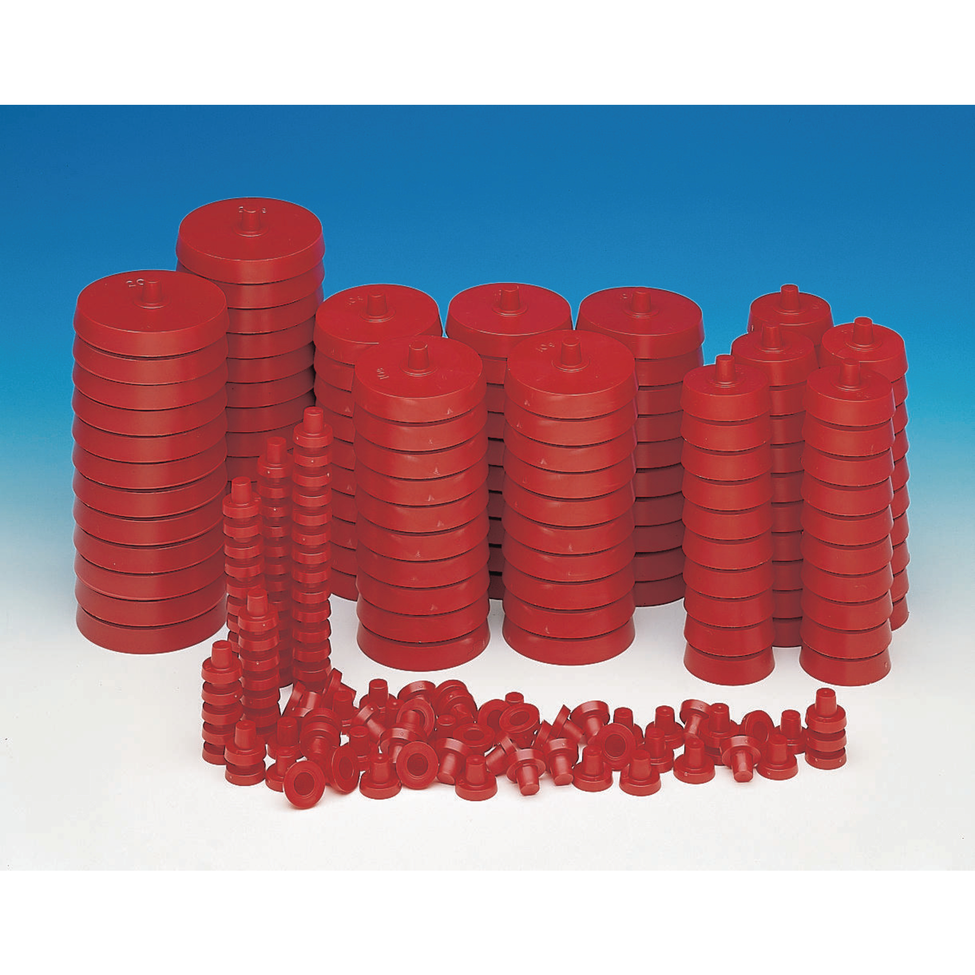 These moulded plastic weights have a central protrusion to facilitate handling and stacking. Contains 100 × 1g, 50 × 5g, 50 × 10g and 25 × 20g. Pack of 225.