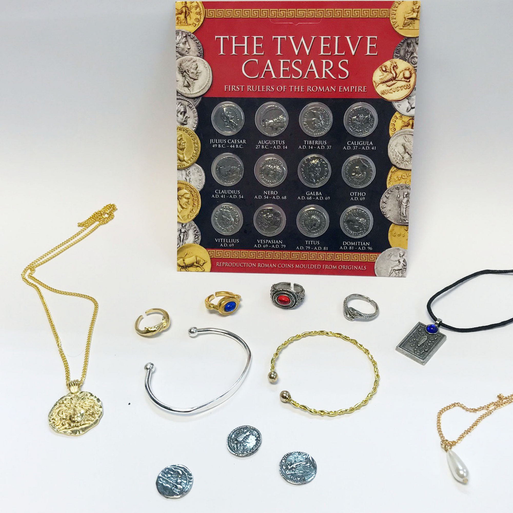 A superb collection of 24 assorted replica Roman Coins, Rings, Pendants and Torcs. Discover more about the life of Romans using the wide variety of replica coins and Jewellery. Explore the significance of the various designs, what each animal meant to them and the achievements and reigns of the emperors (Caesars) depicted on each coin. Create your very own Archaeological dig, prompt creative writing or include as your historical enquiry to piece together the life of the people who would have worn and used such items.