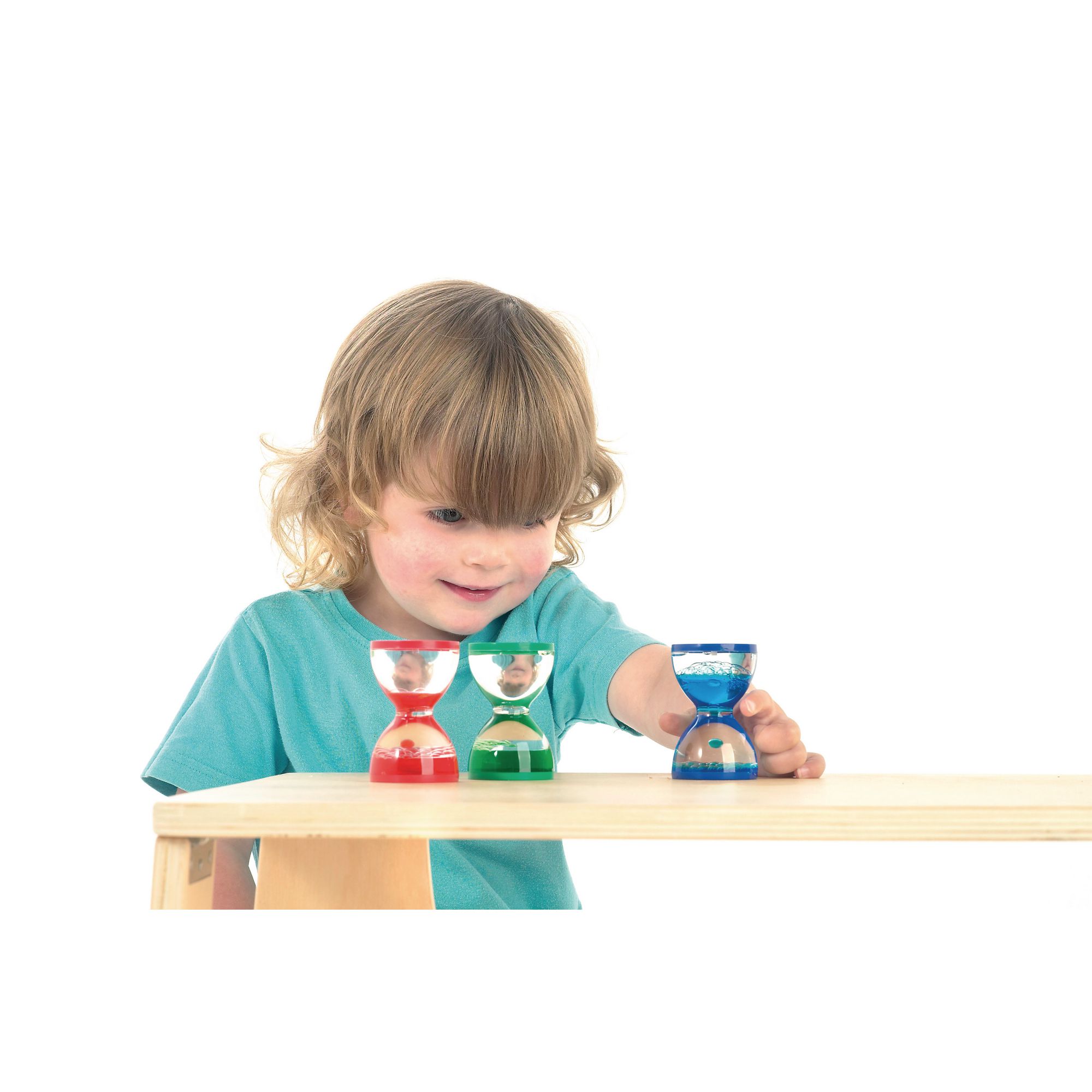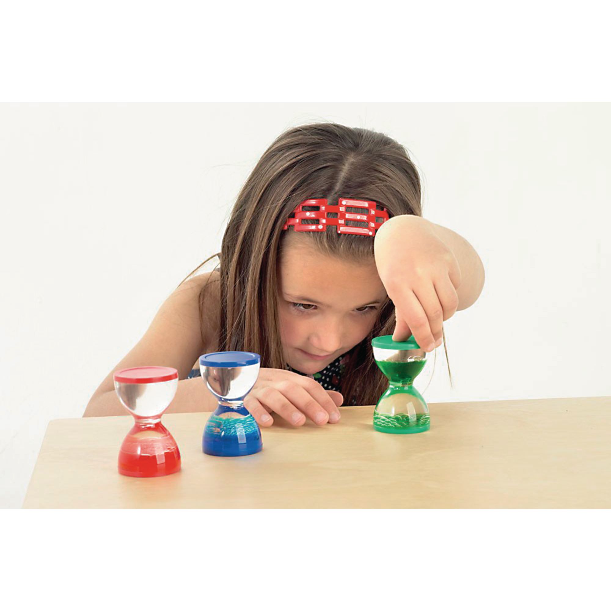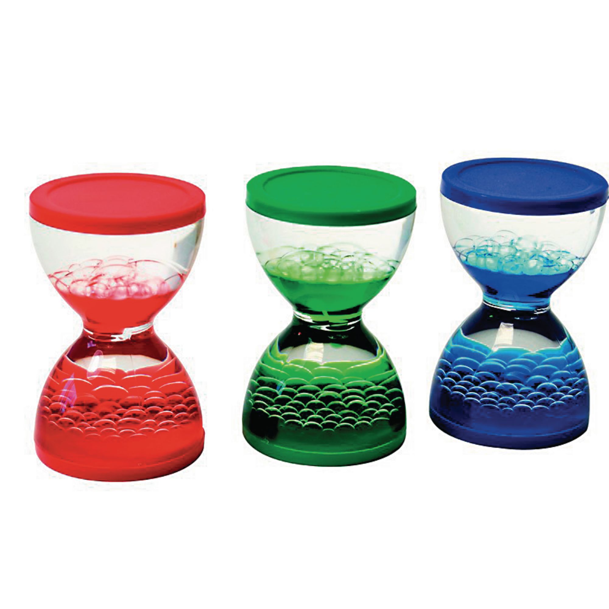 Turn any of these 3 colourful liquid timers upside down and watch the bubbles fall and bounce to the bottom.