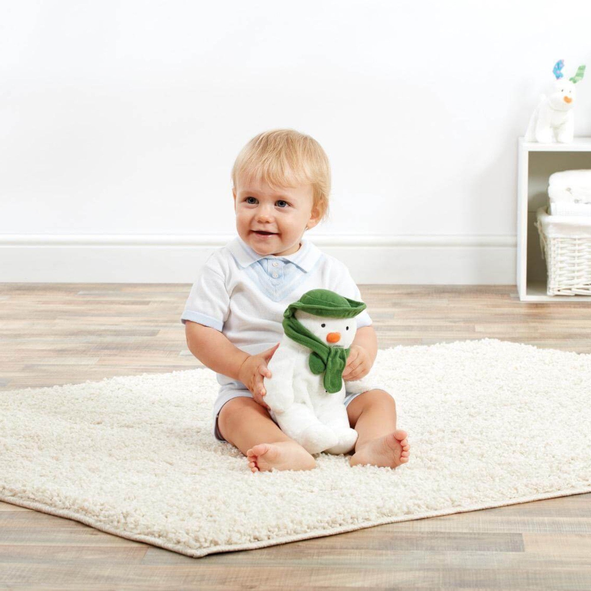 Our Snowman Bean Toy is a super soft toy that is great for children to cuddle at night, or to snuggle up to as they read or watch magical Christmas tales. This snowman is based on the classic Christmas book and film The Snowman by Raymond BriggsThe snowman wears a bright green hat with a matching scarf to keep him snuggly and warm. Also designed with an embroidered mouth and vibrant orange felt nose with embroidered black buttons down the body. He looks like like how does in the film and books, and is easily recognisable by children. Who could resist this little toy?Benefits:Fully tested Washable surfaceMaterials: PolyesterSize: L7.5 x W10 x H16cmAge: birth+