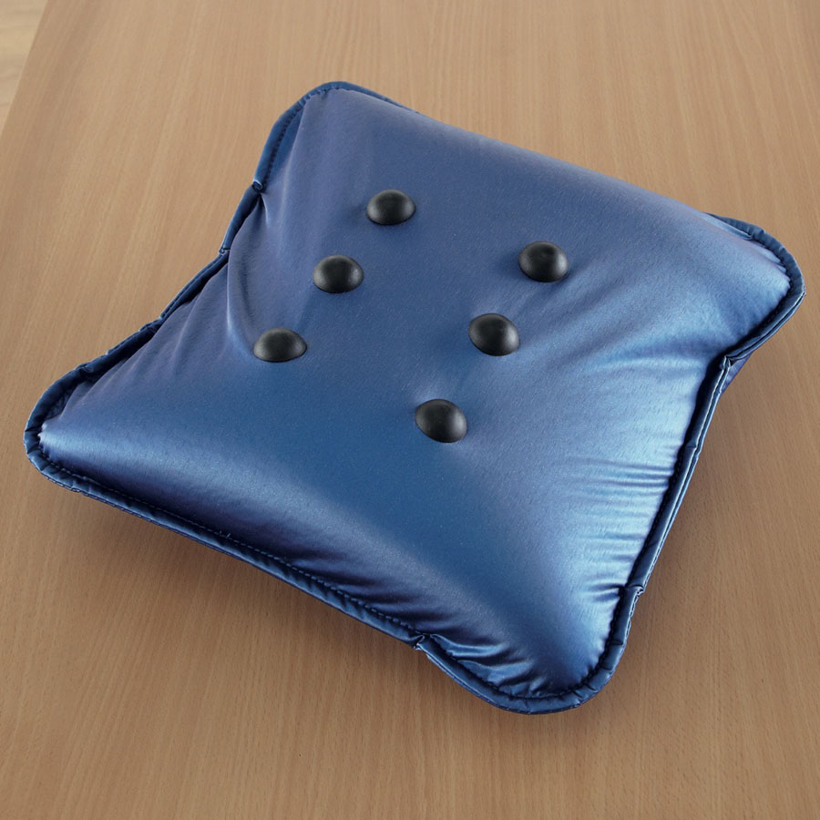 Pressure activated pillow with 6 firm knobs on one side and ultra soft and smooth vinyl on the other. It starts vibrating as soon as you squeeze it, to turn it off, just remove pressure and the vibration stops. There are no cords, remotes, or switches to worry about, just, 2 x D batteries (included). W30 x L30cm.