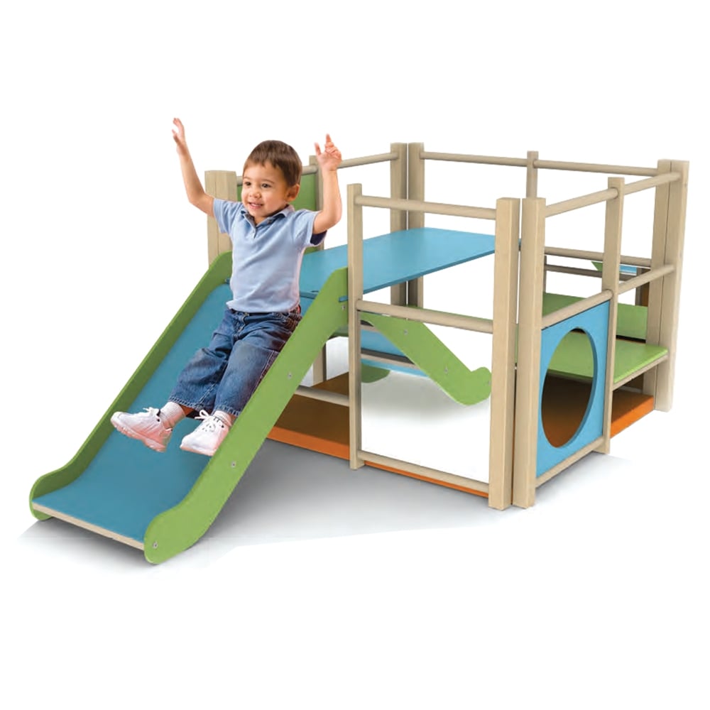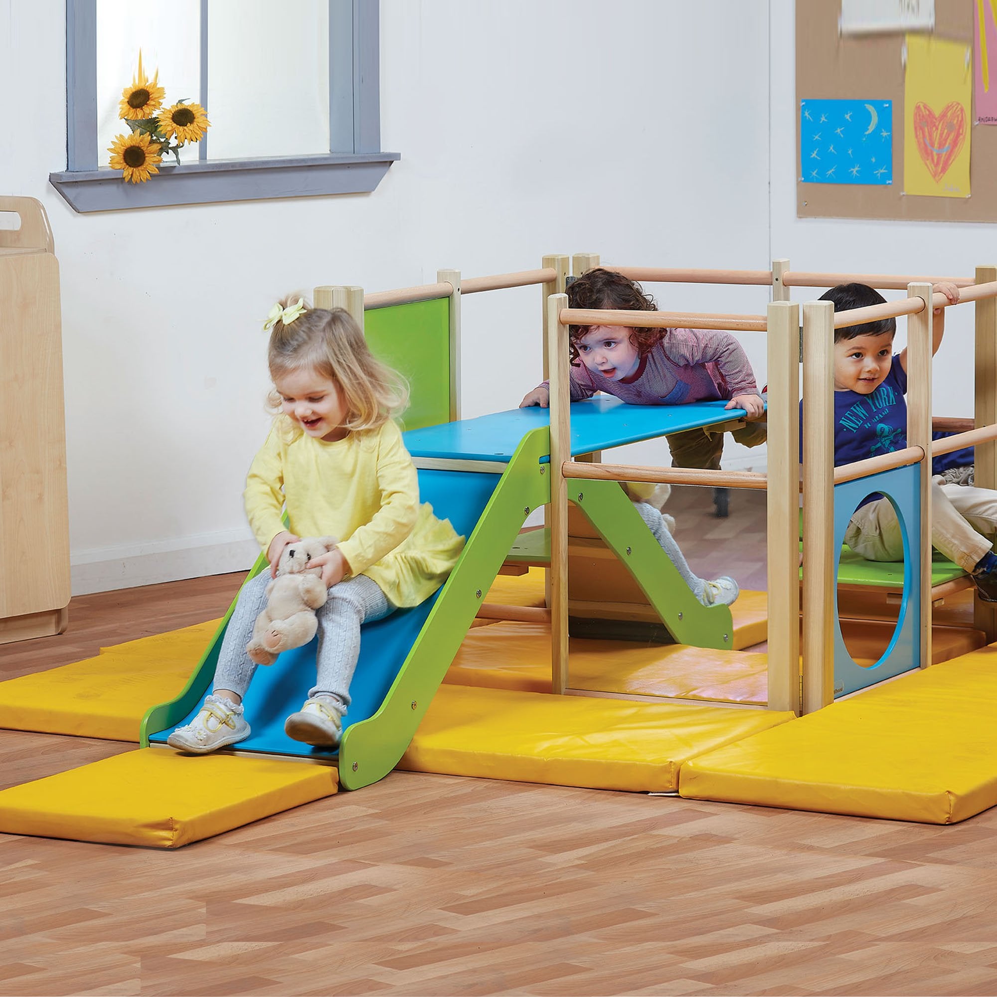 Designed specifically for early years’ activities – not a scaled down version of a larger climbing frame. Manufactured to a high standard from 12mm faced MDF with solid timber frame. Incorporates a crawl through panel, 2 reflective panels and a plain panel. Includes 2 platforms, a slide and an internal safety mat. Folds away for easy storage. Assembled size: 102 x 170Â x H77cm. Platform heights: 21cm and 48cm.Standard delivery times may not apply to this product. Please contact Customer Care if you require further information.